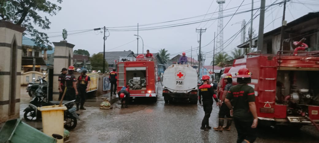 MORUT- Satuan Polisi Pamong Praja (Polpp) dan Pemadaman Kebakaran (Damkar) turunkan 30 personil bantu warga di ibu kota Kolonodale, yang terendam banjir. Selasa, 4 april 2023.