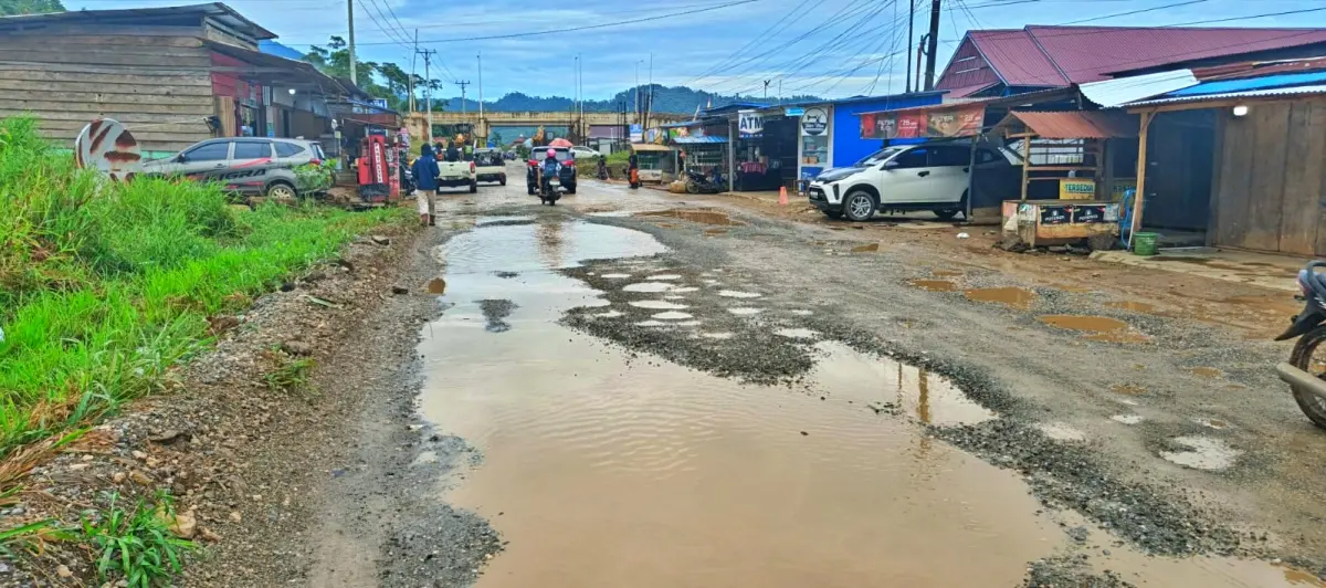 Kerusakan jalan nasional Trans Sulawesi di Bungintimbe, Kecamatan Petasia Timur meningkatkan risiko kecelakaan, terutama akibat lalu lintas kendaraan berat bertonase tinggi.
