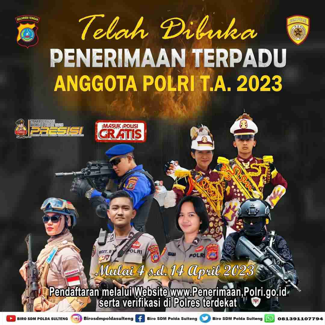 PALU, Pemuda-pemudi di Sulawesi Tengah yang ingin menjadi anggota Polri untuk mengabdikan diri kepada masyarakat, Bangsa dan Negara, Polri kembali membuka penerimaan terpadu anggota Polri Tahun Anggaran (T.A.) 2023,